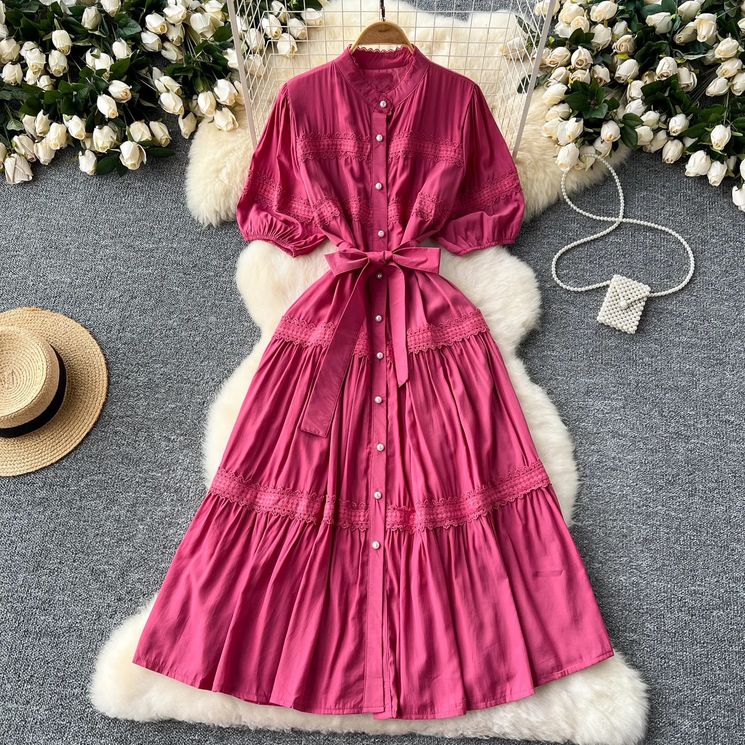 Customized Retro Round Neck Pearl Short Sleeved Waist Ruffle Dress Women